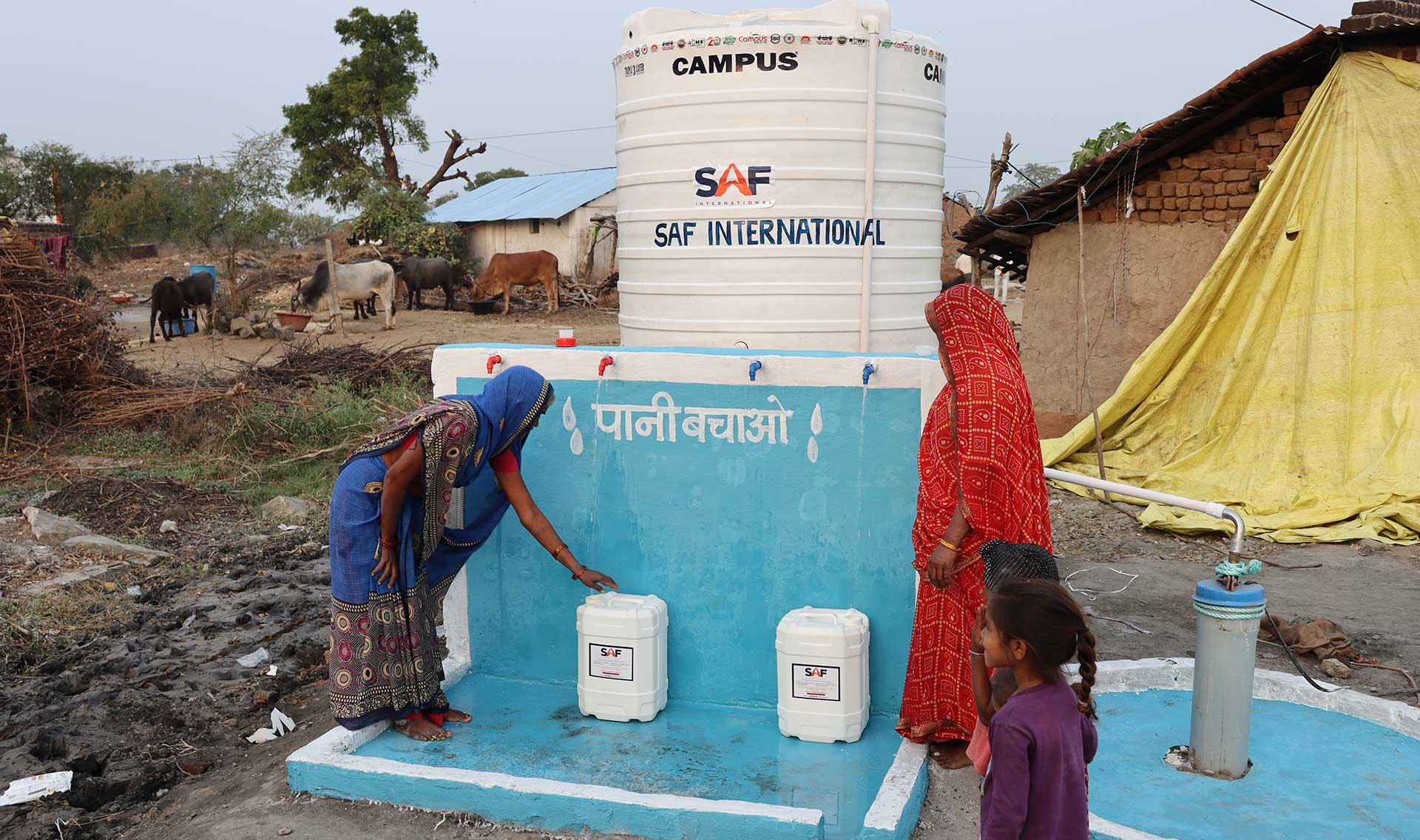 In 2021, SAF International took on this challenge. Despite the difficult terrain, we successfully drilled a borewell that struck clean water. But we didn’t stop there. We installed a motorized pump, a large water storage tank, and user-friendly faucets to prevent water wastage. To ensure families could easily collect and store water, we distributed water cans throughout the community.